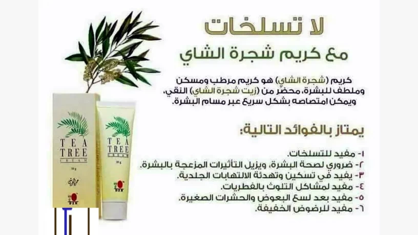 كريم شجرة الشاي لحب الشباب وللاكزيما وغيرها من الامراض الجلدية مفيد جدا ، ويفضل قبل استخدام الكريم، ان تغسل الوجه بصابون جانوزي.